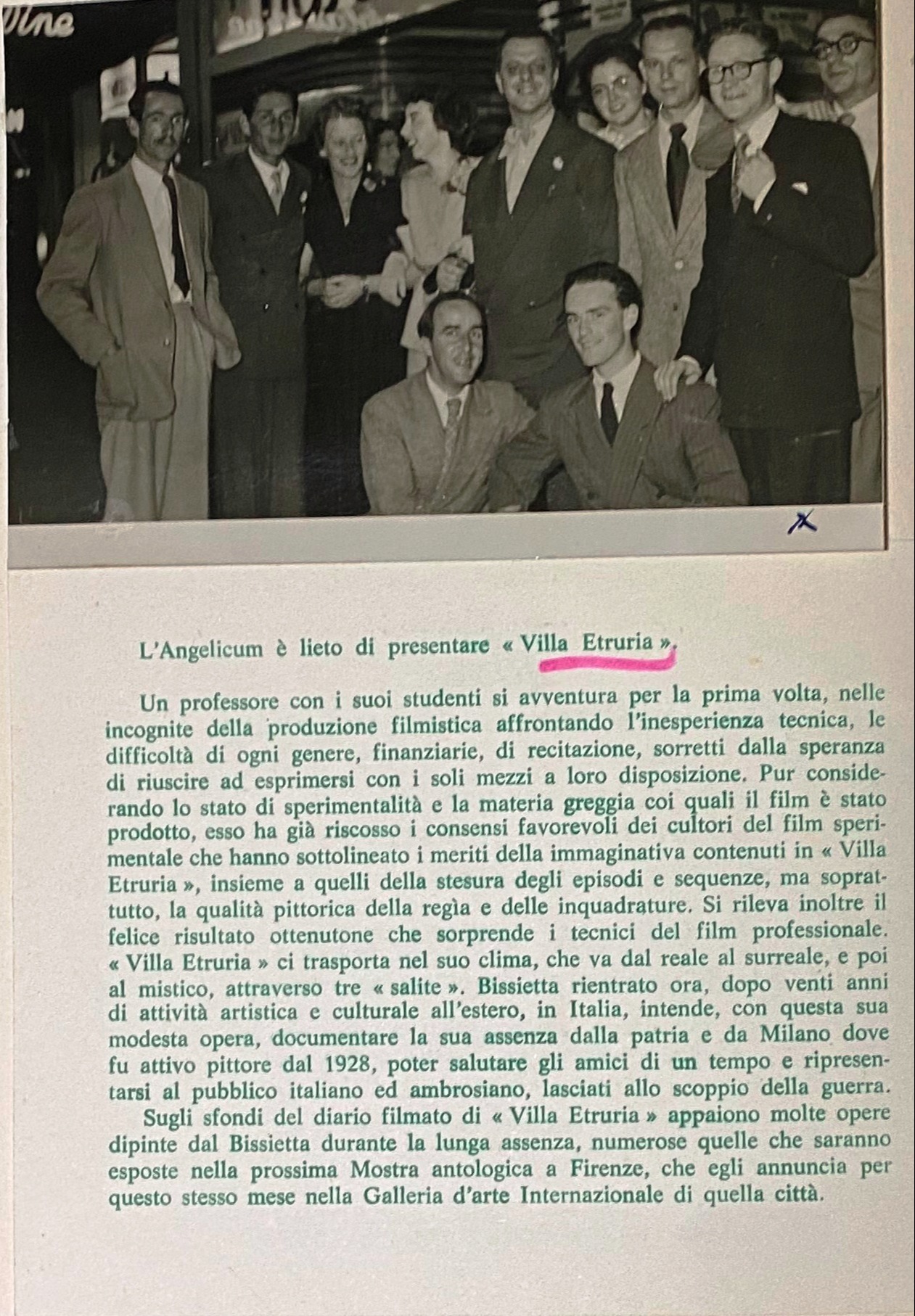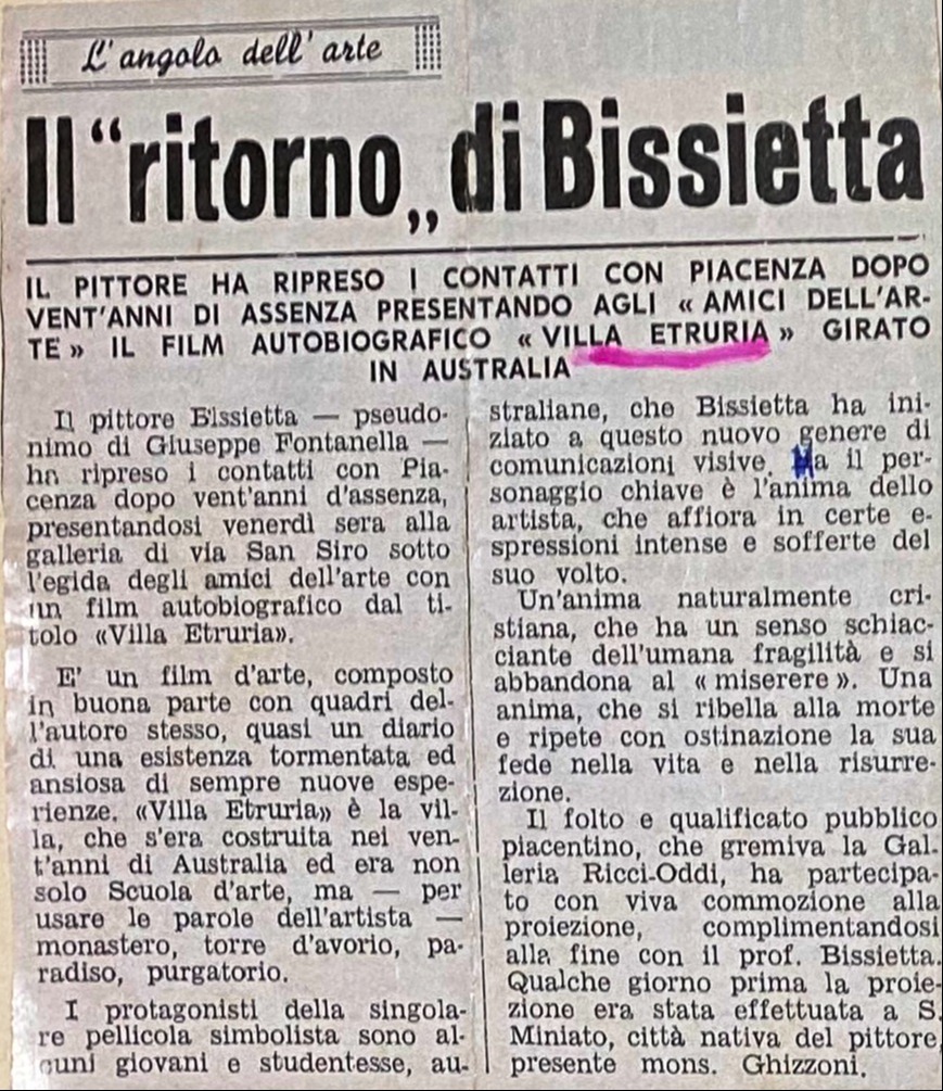 Bissietta in Australia produsse un cortometraggio autobiografico con la collaborazione diretta di alcuni suoi studenti in cui narra l'inserimento dell'artista nel nuovo continente ......... . Al rientro in Italia, presenta il suo film a Milano, San Miniato, Perugia, Gattatico, ... ...